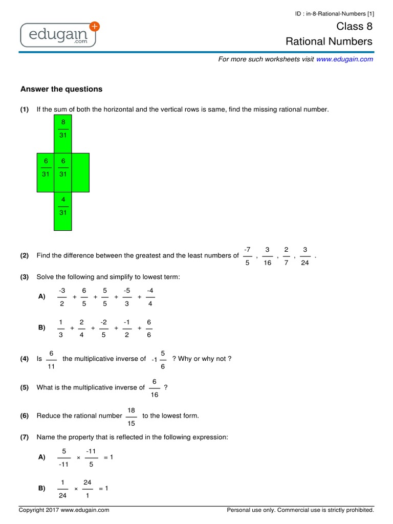 Class 8 Mathematics Rational Numbers Worksheets - CBSE NCERT Solutions These Worksheets for Grade 8 Mathematics Rational Numbers cover all important topics which can come in your standard 8 tests and examinations. Free worksheets for CBSE Class 8 Mathematics Rational Numbers, school and class assignments, and practice test papers have been designed by our highly experienced class 8 faculty.